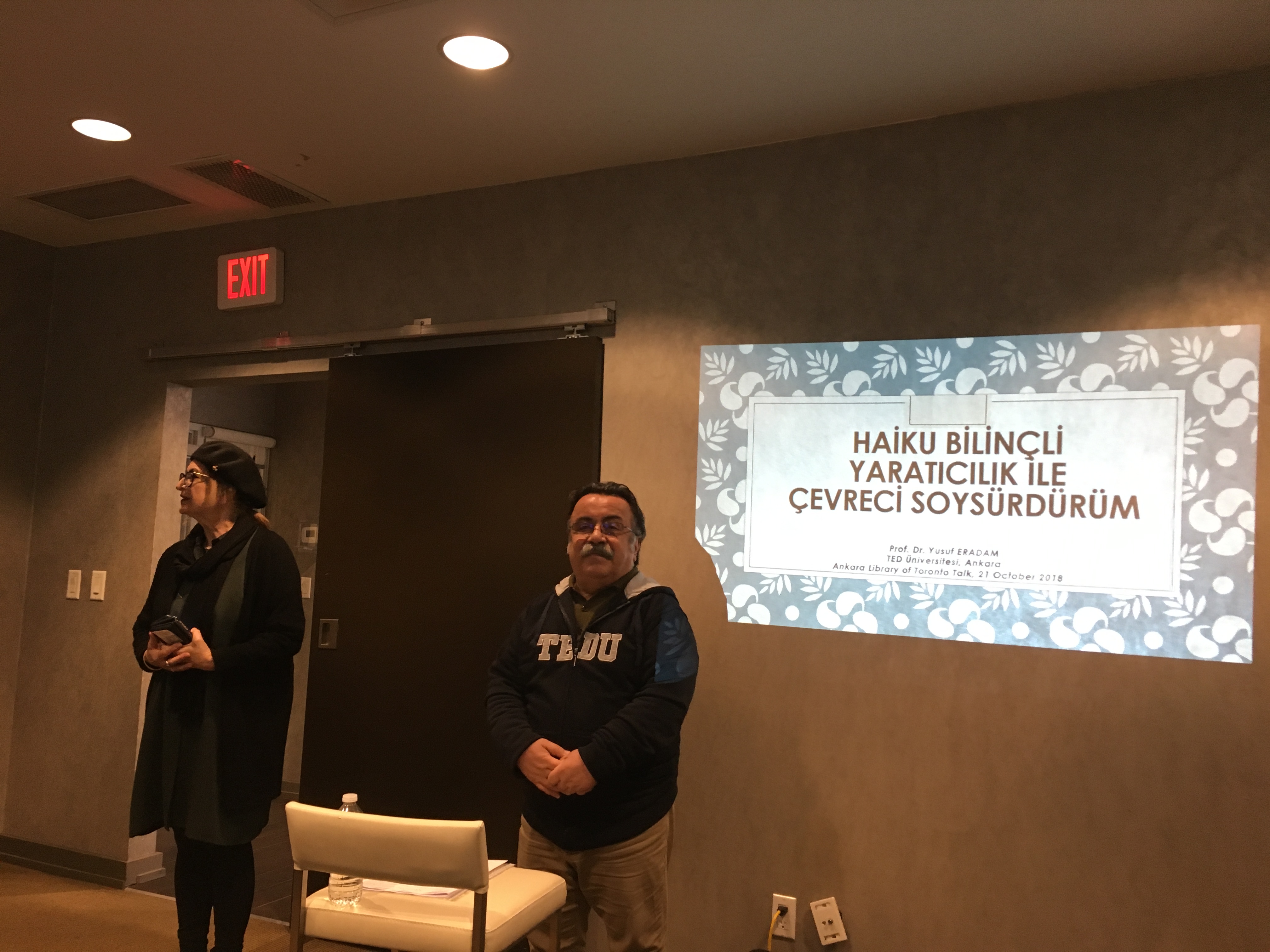 İngiliz Dili ve Edebiyatı Bölümü Başkanımız Prof. Dr. Yusuf Eradam, Ankara Kitaplığı’nın davetlisi olarak Toronto’da “Haiku Bilinçli Yaratıcılık ile Çevreci Soysürdürüm” başlıklı konuşması ile çevre sorunlarına yaratıcılık edimleriyle çözüm getirme bilincine dikkat çekti. Eradam’ın konuşmasına Kanada’nın çeşitli yerlerinden dinleyici geldi ve yerel kanal Turkuaz TV, Prof. Dr. Yusuf Eradam ile söyleşi yaptı.